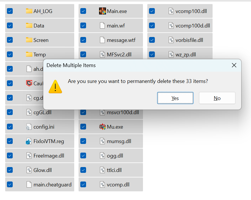 - Cách 2: Vào thư mục chứa game bằng File Explorer, Chọn tất cả các file trong thư mục MU Giang Hồ rồi bấm Shift + DEL trên bàn phím, chọn Yes